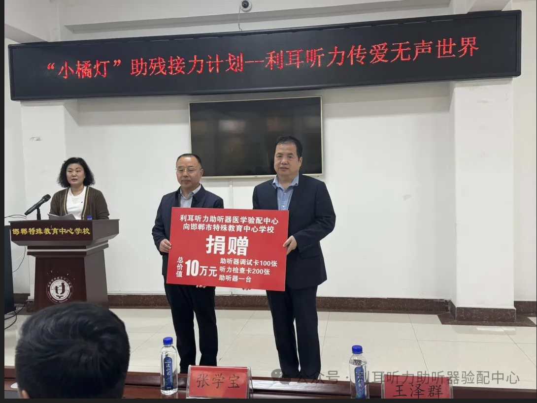 利耳听力助听器医学验配中心响应邯郸市团市委号召,于2025年4月18日上午向邯郸市特殊教育中心学校捐赠总价值10万元的听力检查卡200张、助听器调试卡100张、助听器一台,为听障儿童送去温暖,践行企业社会责任,让更多的孩子享受优质的听力服务。